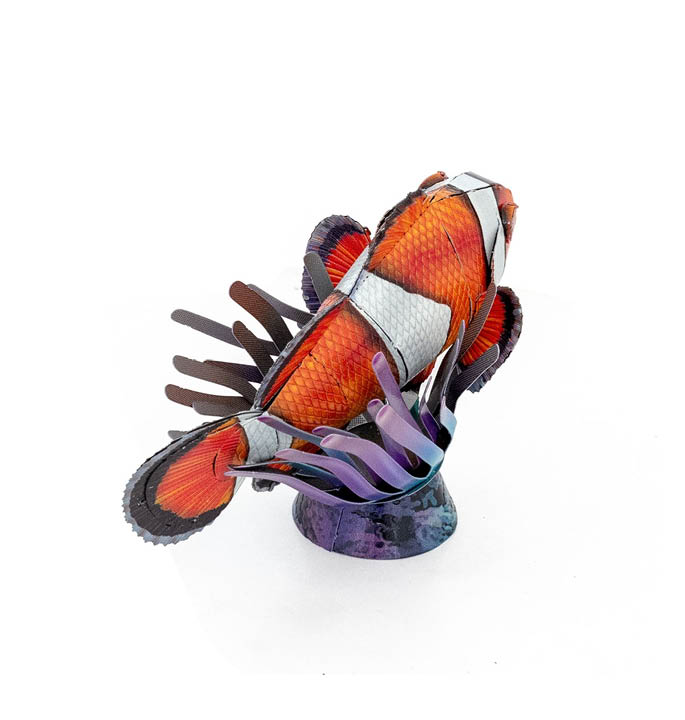 Metall Erde erweckt den außergewöhnlichen Clownfisch in einer raffinierten Metallmodellierung zum Leben. Clownfische, auch bekannt als Anemonenfische, leben in einer symbiotischen Beziehung mit Seeanemonen. Die Anemone bietet Schutz vor Raubtieren, Nahrung und einen sicheren Unterschlupf. Im Gegenzug sorgt der Clownfisch für zusätzliche Wasserzirkulation und seine leuchtende Farbe kann kleine Fische anlocken, die dann von der Anemone gefangen werden.