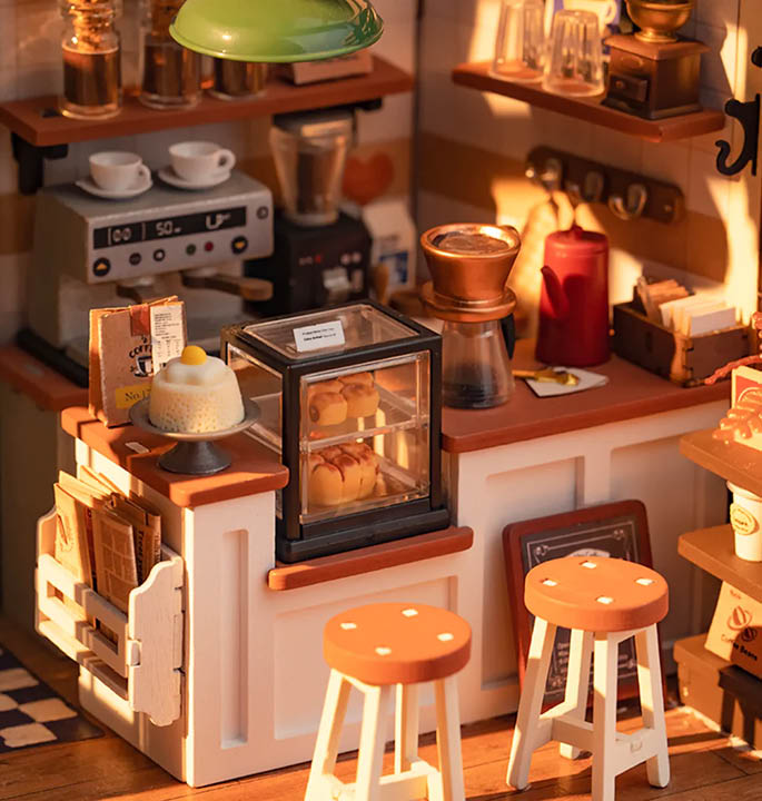 Treten Sie ein in die zauberhafte Welt des Robotime Café Miniatur-Kaffeehauses und lassen Sie sich von einer warmen, nostalgischen Atmosphäre mitreißen. Es fühlt sich an wie eine luxuriöse Kaffeebar, in der Sie sich völlig entspannen, genießen und in einen Hauch von Retro-Charme eintauchen können. Dieses von klassischen Coffee Shops inspirierte Miniaturhaus ist voller schöner Holzdetails, die dem Raum eine gemütliche, einladende Atmosphäre verleihen.
