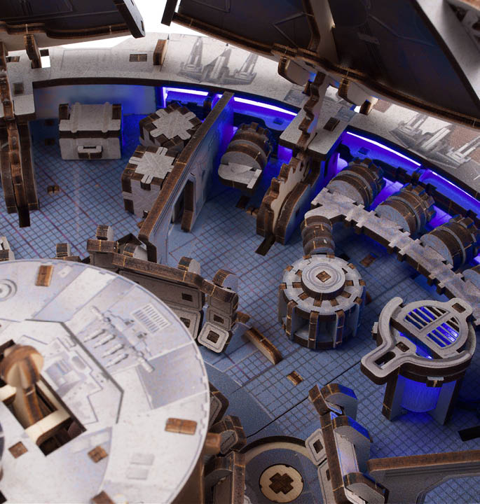 The model has detailed, colored parts inside and out to look exactly like the ship from the movies. In addition, it has battery-powered blue LED lights that mimic the glow of the hyperdrive engine. Many parts are movable, such as the boarding ramp, cargo bay door, landing gear, gun turrets, rotating antenna and retractable roof that reveals the interior. Sturdy materials such as high-quality fiberboard and cardboard add detail and durability.