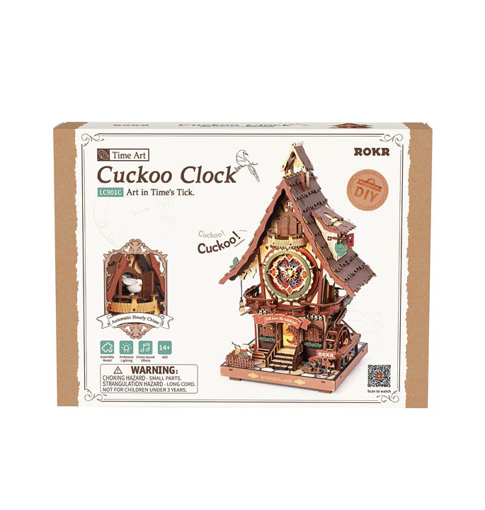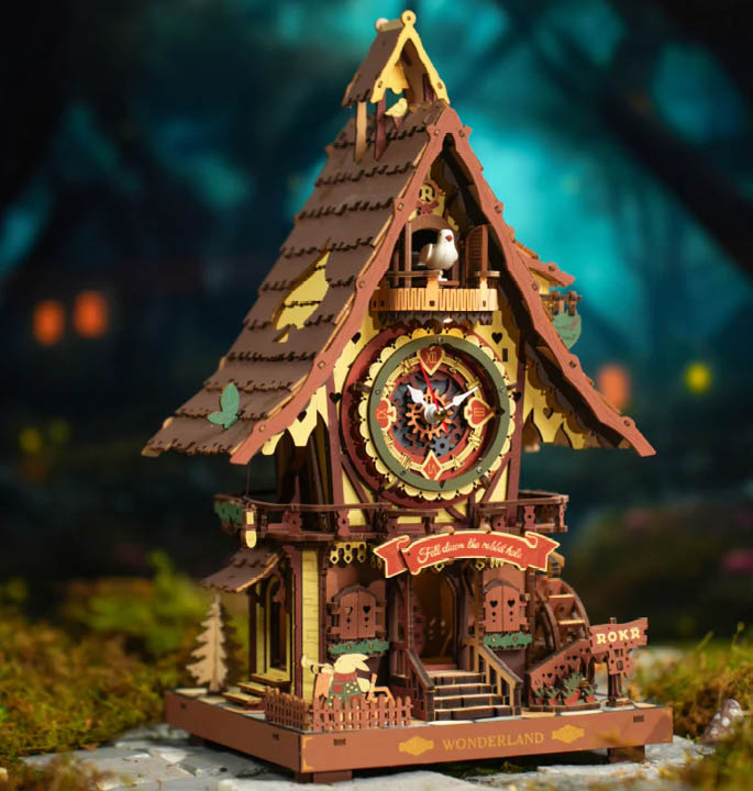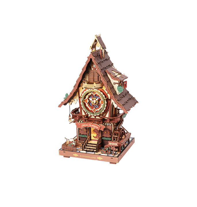 De houten ROKR Koekoeksklok lijkt zo uit een sprookjesboek te komen en brengt je nauwkeurige tijd, speelse charme en de schoonheid van traditioneel Duits houtwerk. Het toont een bosachtig huisje verscholen in een betoverd woud, compleet met een draaiend waterrad, houten hekken en groenrijke omgeving.