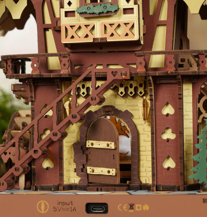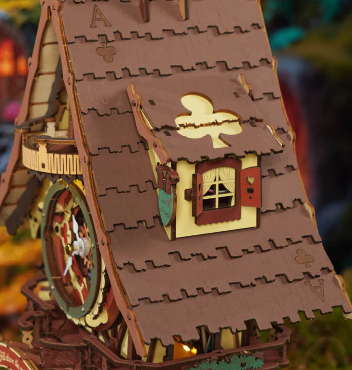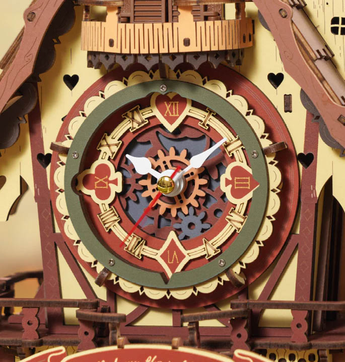 De klok heeft een koekoek die elk uur klinkt, een halvemaanvormig slingermechanisme, een rieten dak en een ouderwetse treklichtschakelaar. Speelse details zoals symbolen van speelkaarten op het dak en de klok geven het een extra charme. Een verborgen trap-schakelaar laat de koekoek klinken of schakelt het uurlijkse geluid in en uit.