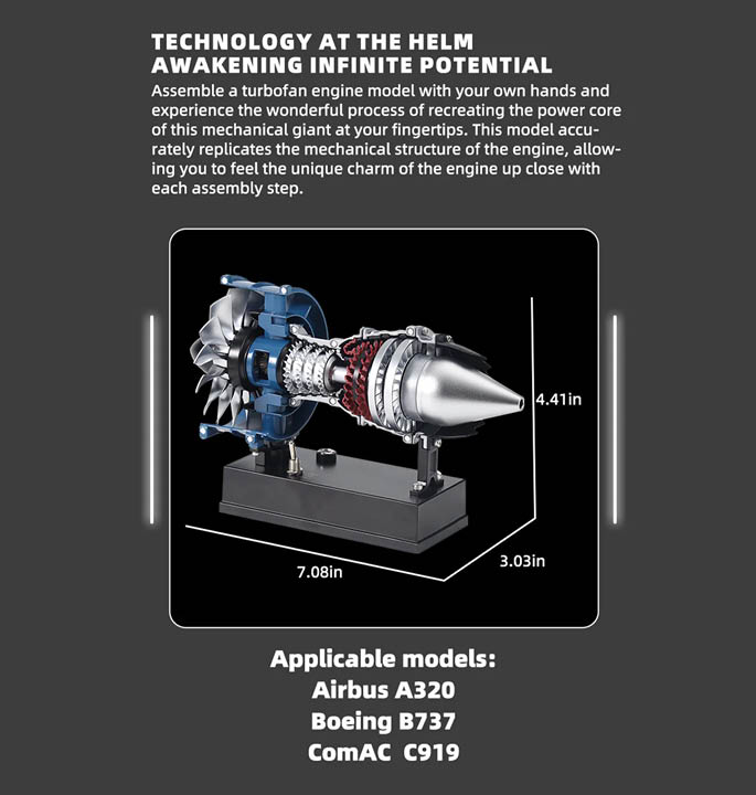Turbofanmotoren vormen de basis van moderne vliegtuigen en staan bekend om hun efficiënte combinatie van kracht en brandstofverbruik. Dit schaalmodel laat op een toegankelijke manier zien hoe alle onderdelen samenwerken, waardoor het niet alleen een boeiend bouwproject is, maar ook een waardevol en stijlvol leermiddel voor iedereen met interesse in luchtvaart en techniek.